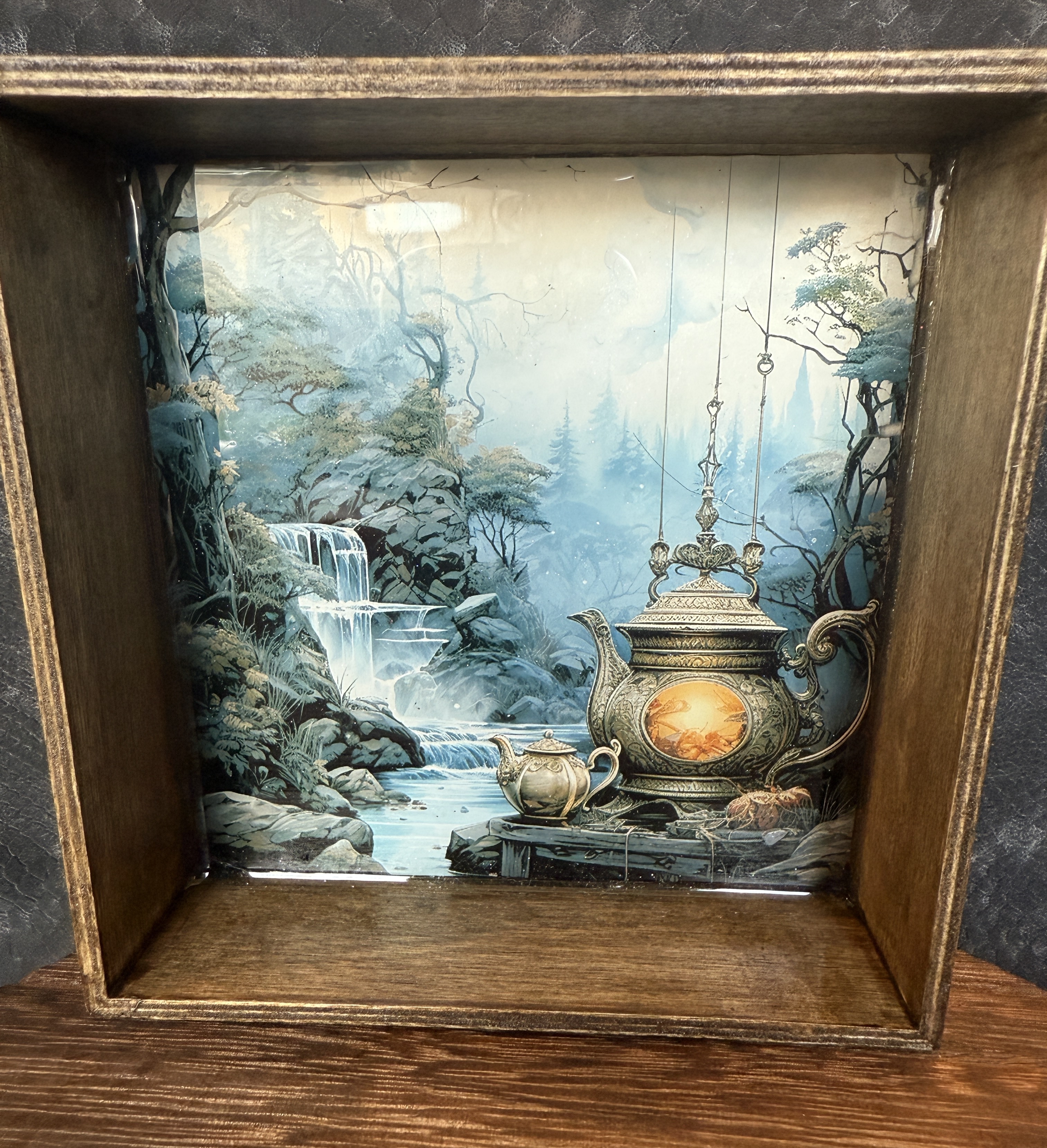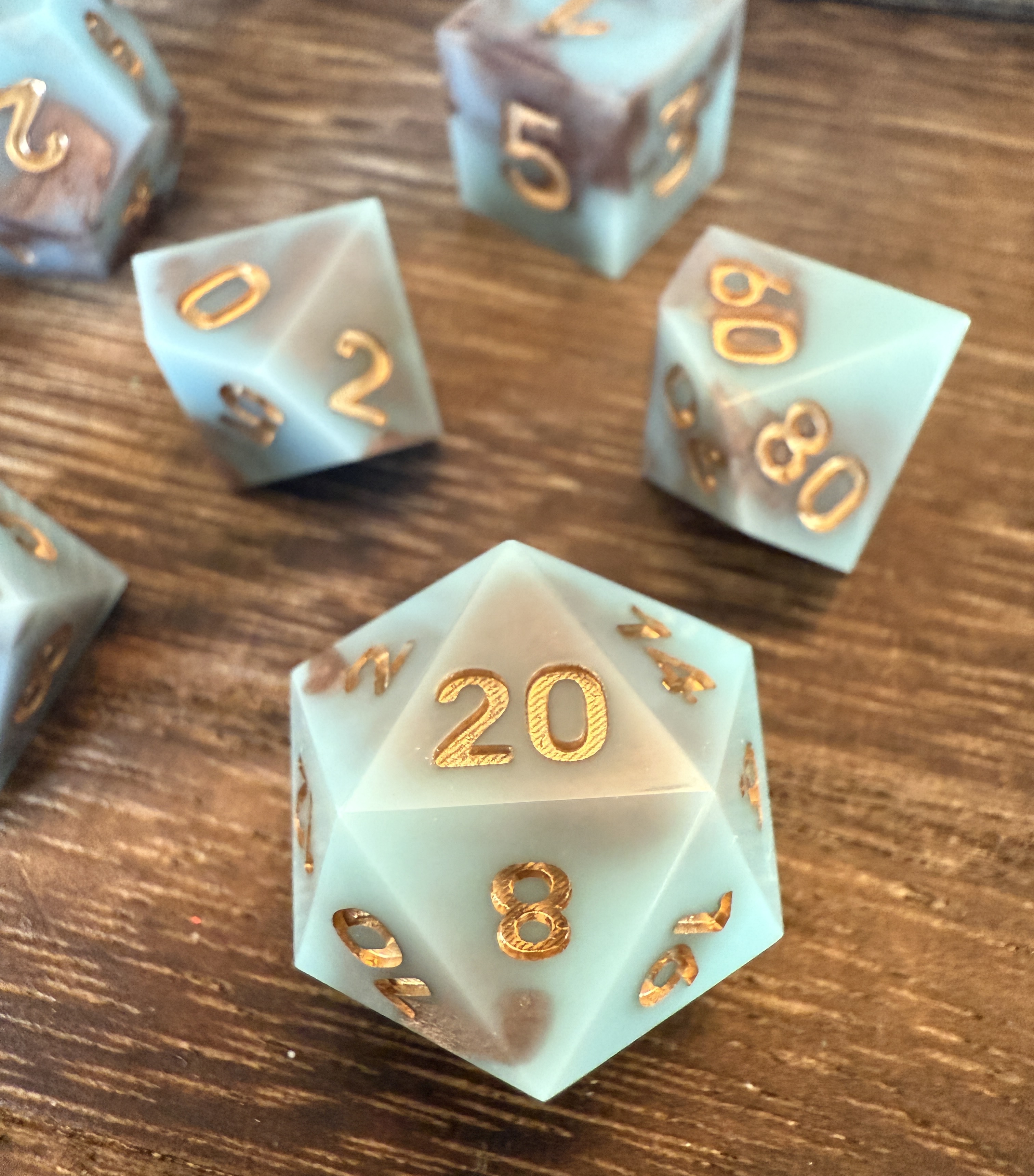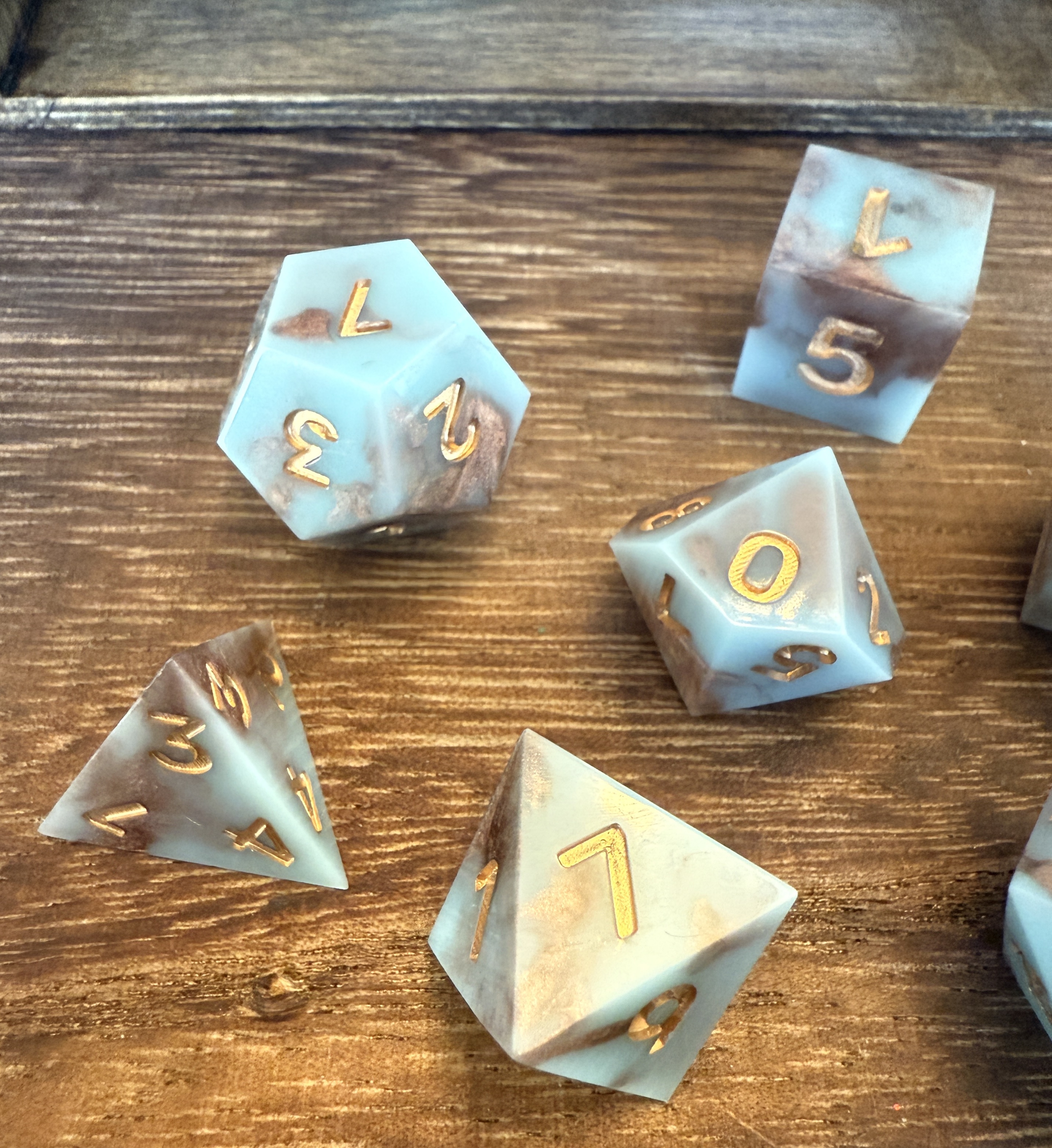 Elevate your gaming experience with this exquisite set of sharp edge dice, featuring mesmerizing swirls copper and blue. Each die is meticulously inked with copper numbers, adding a touch of elegance and readability to your rolls.The matching dice tray is a hand stained wood box and hand poured resin over the image in the bottom.