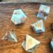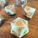 All of my dice are crafted from resin. I hand-pour the resin and add various alcohol inks and mica powders to create beautiful effects. My shell-type dice may include inclusions such as paper butterflies, moss, flowers, etc., and some have the inner shell wrapped in Washi tape. These dice are made using a double casting method (which requires two separate rounds in a pressure pot for 24 hours each): first, the inner dice are cast and a pattern or inclusion is applied, then a second casting of clear resin is done around the insert. The dice are then placed in a pressure pot for 24 hours to remove any bubbles. After curing for a few days, I sand off the excess resin. The dice are then polished in a tumbler with a polishing compound to give them a shine. They are cleaned with soap and water, and then prepared for inking. I hand ink each die, usually in a complementary color, using acrylic inks. Finally, they are polished by hand one last time.