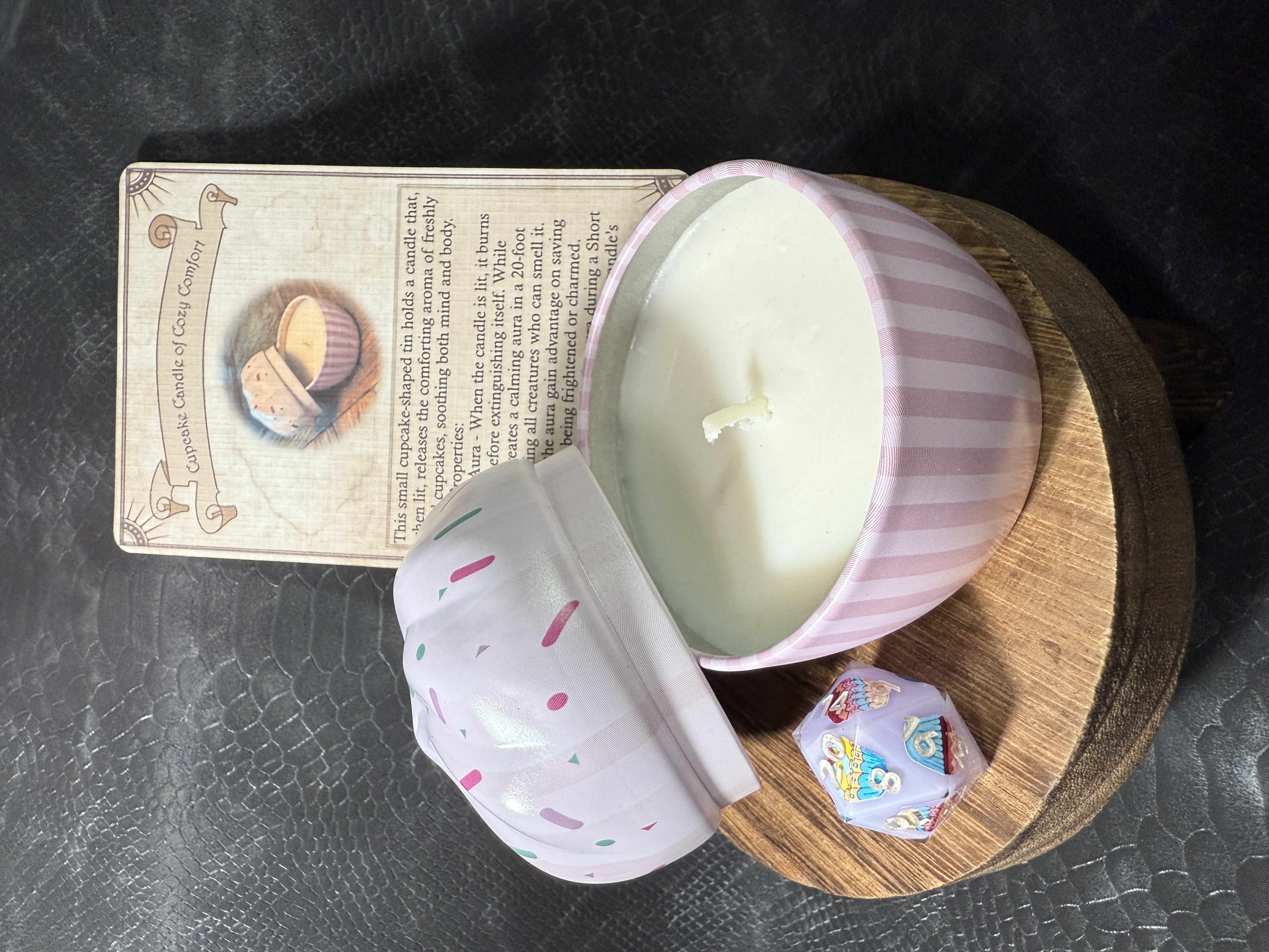 The Cupcake Candle of Cozy Comfort comes with a cupcake-themed sharp edge dice set, a magic item card (also accessible on D&D Beyond), and a cupcake-shaped tin candle, to bring both warmth and whimsy to your gaming table. The candle releases the comforting aroma of freshly baked cupcakes, a scent so sweet, even the fiercest dragon might pause for a sniff.