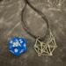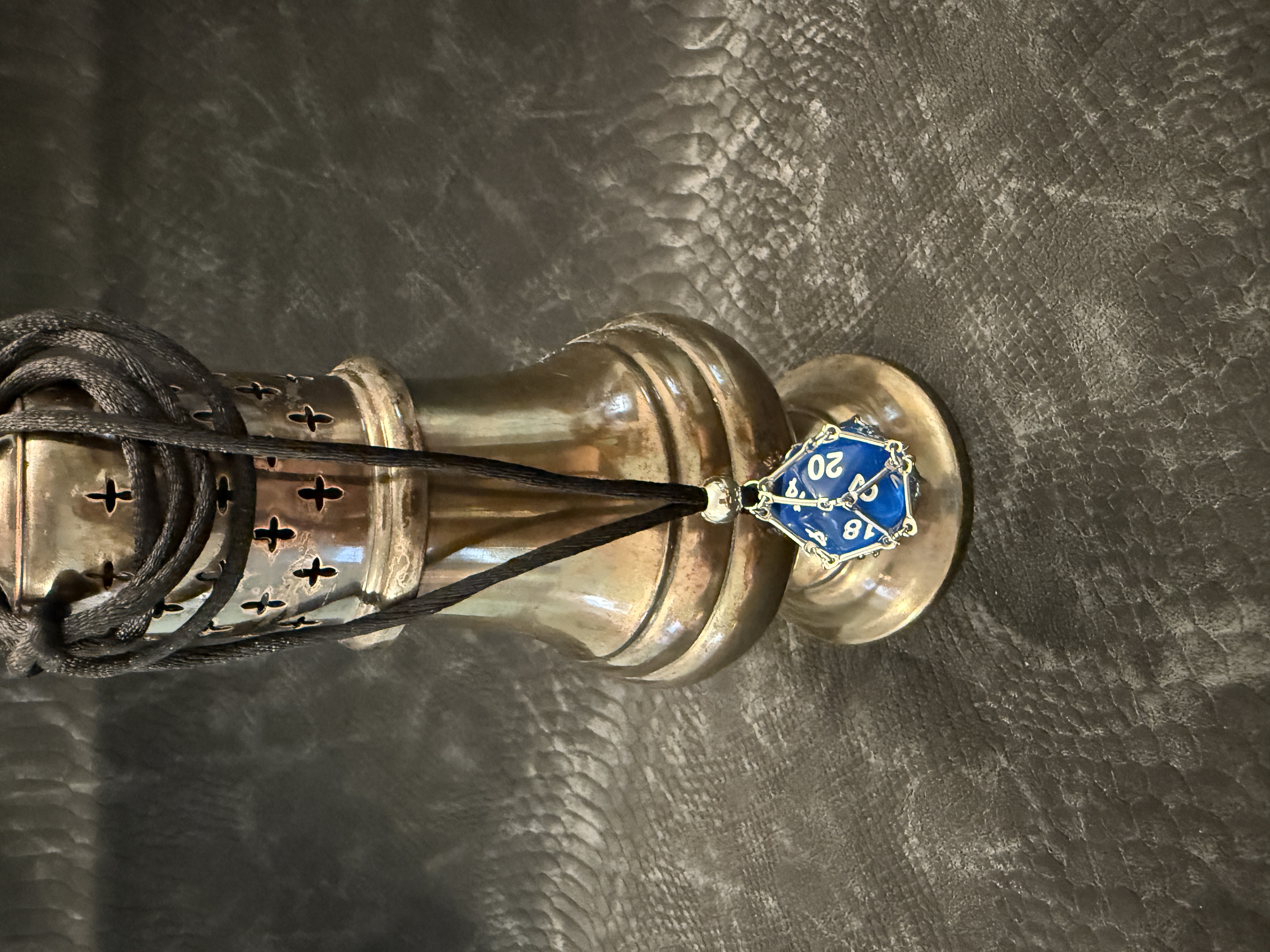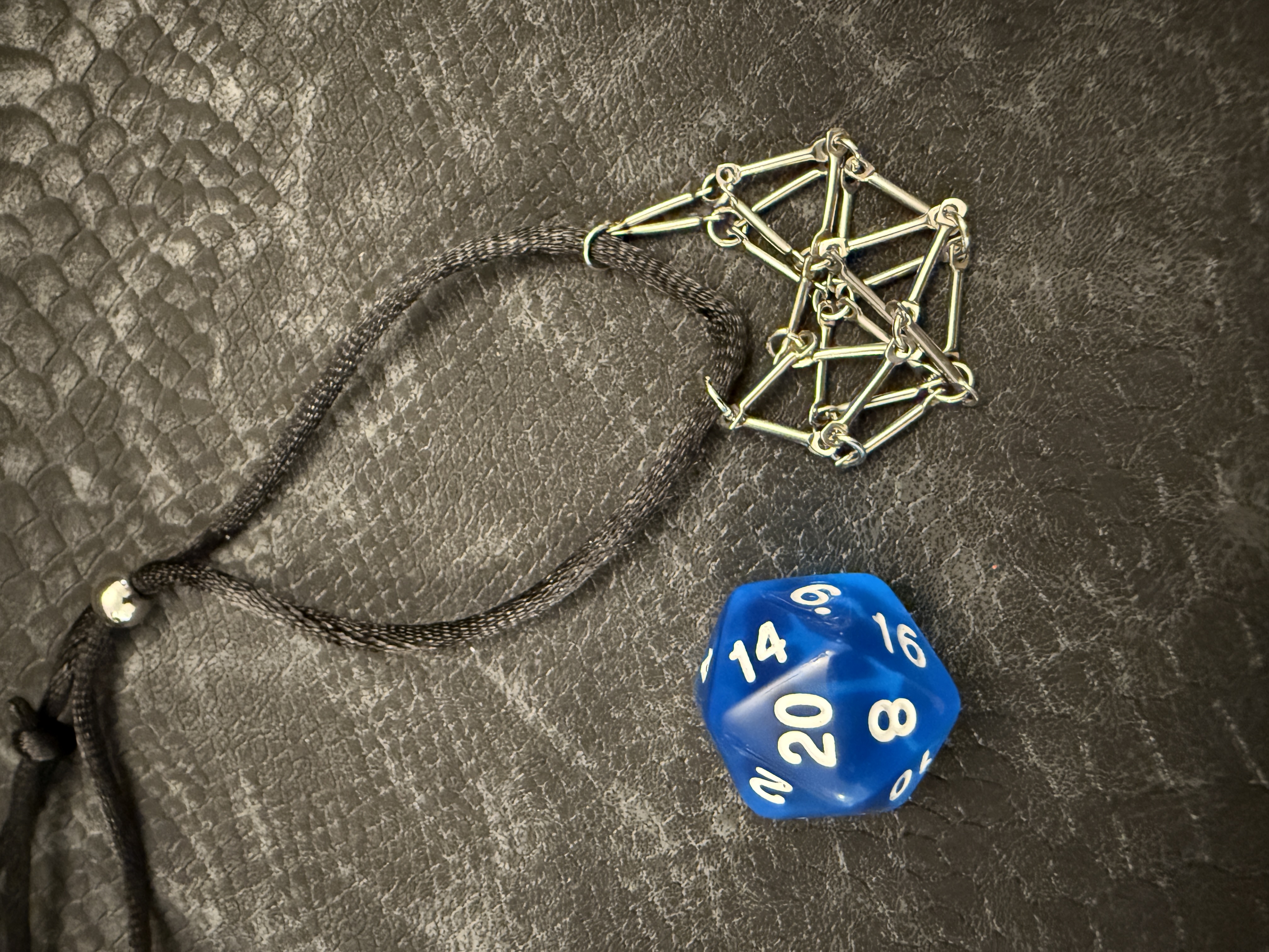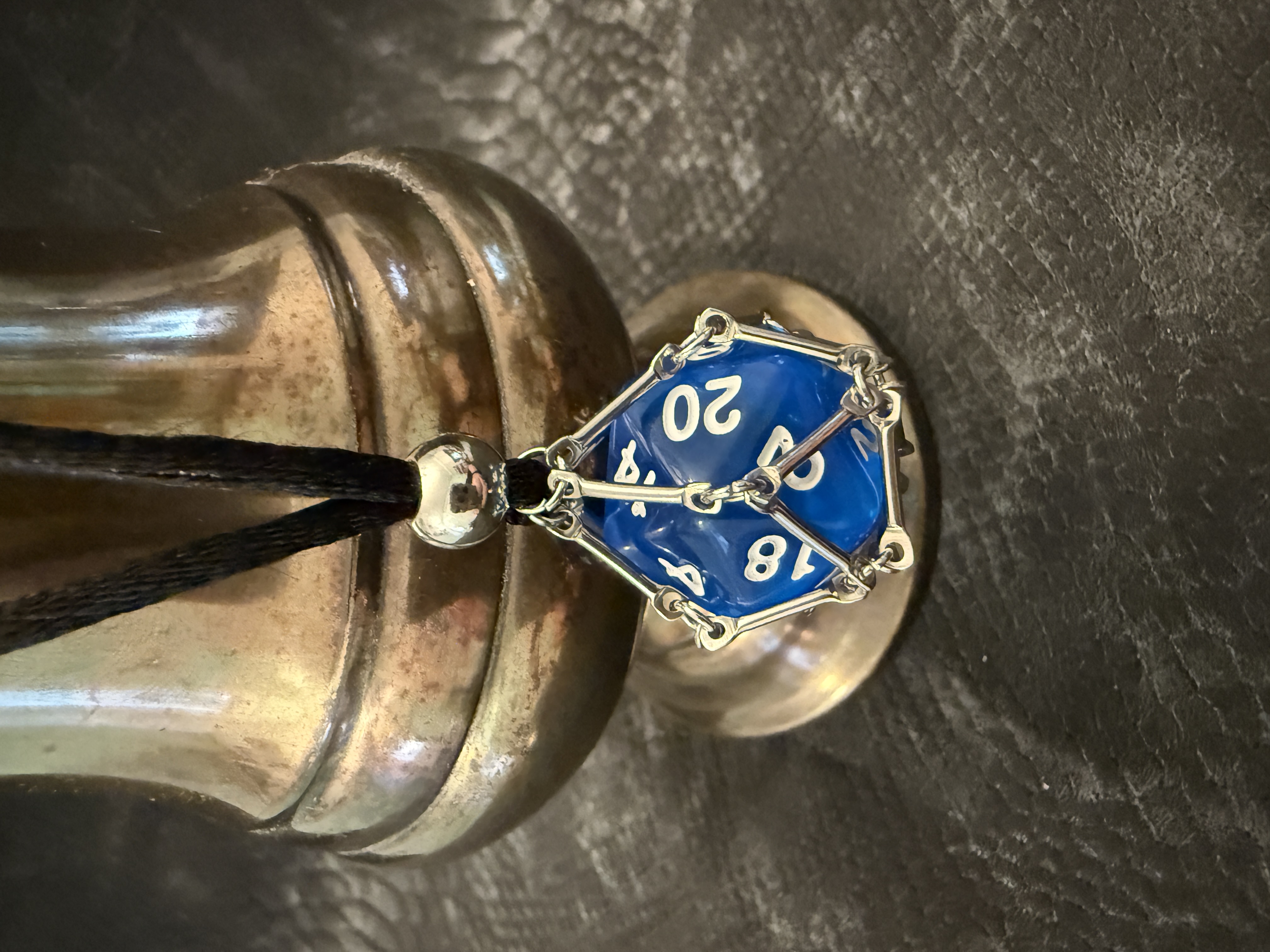 Embrace your love for gaming with this versatile D20 basket cage necklace, designed to keep your favorite die close at hand. The intricately crafted cage securely holds a D20, allowing you to easily swap out the die to match your mood, outfit, or current campaign. Made from black cording and stainless steel, this necklace is both a stylish accessory and a functional piece of your gaming gear. Whether you're wearing it as a token of luck or as a statement piece, this necklace adds a touch of personal flair to any outfit.