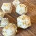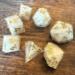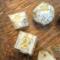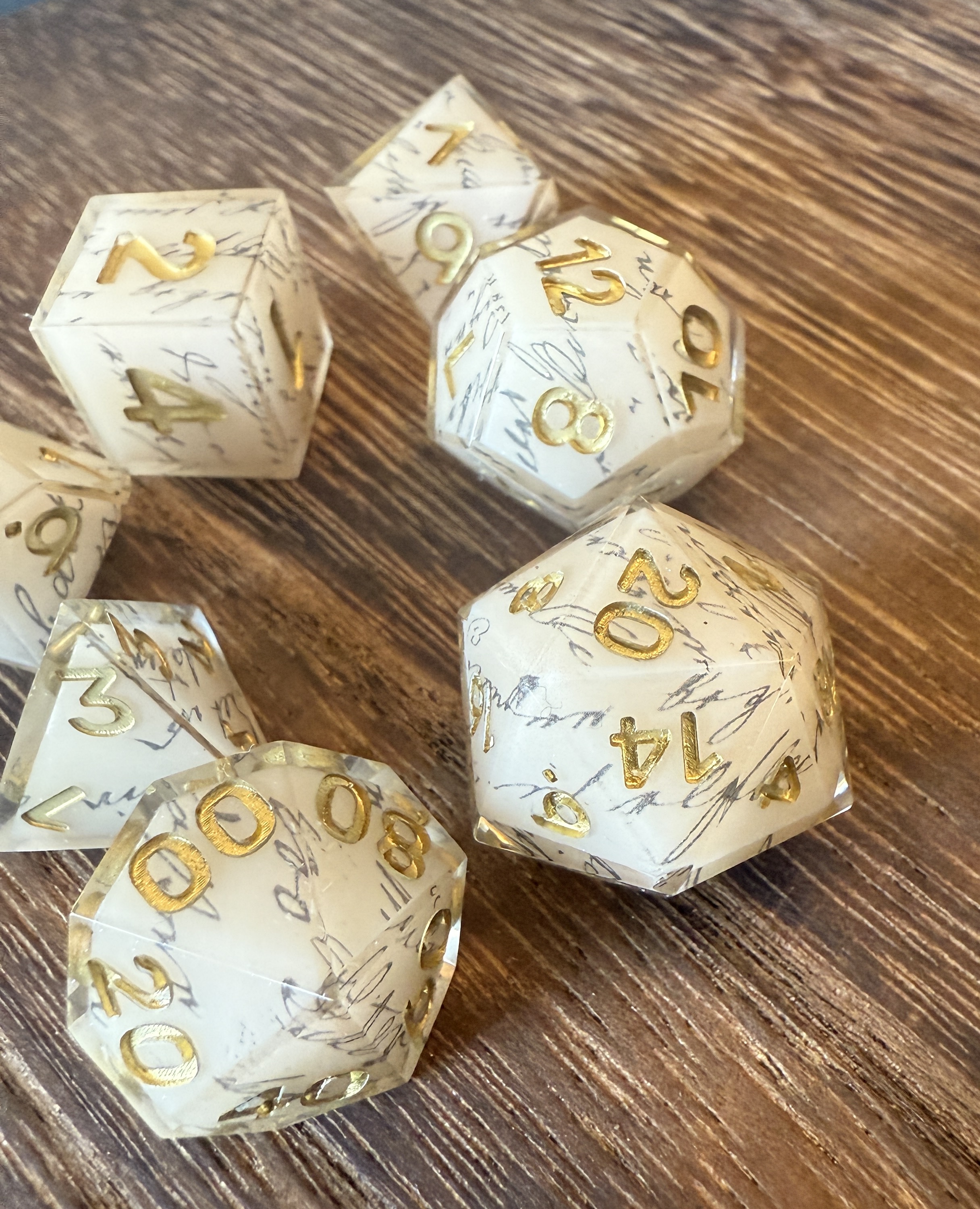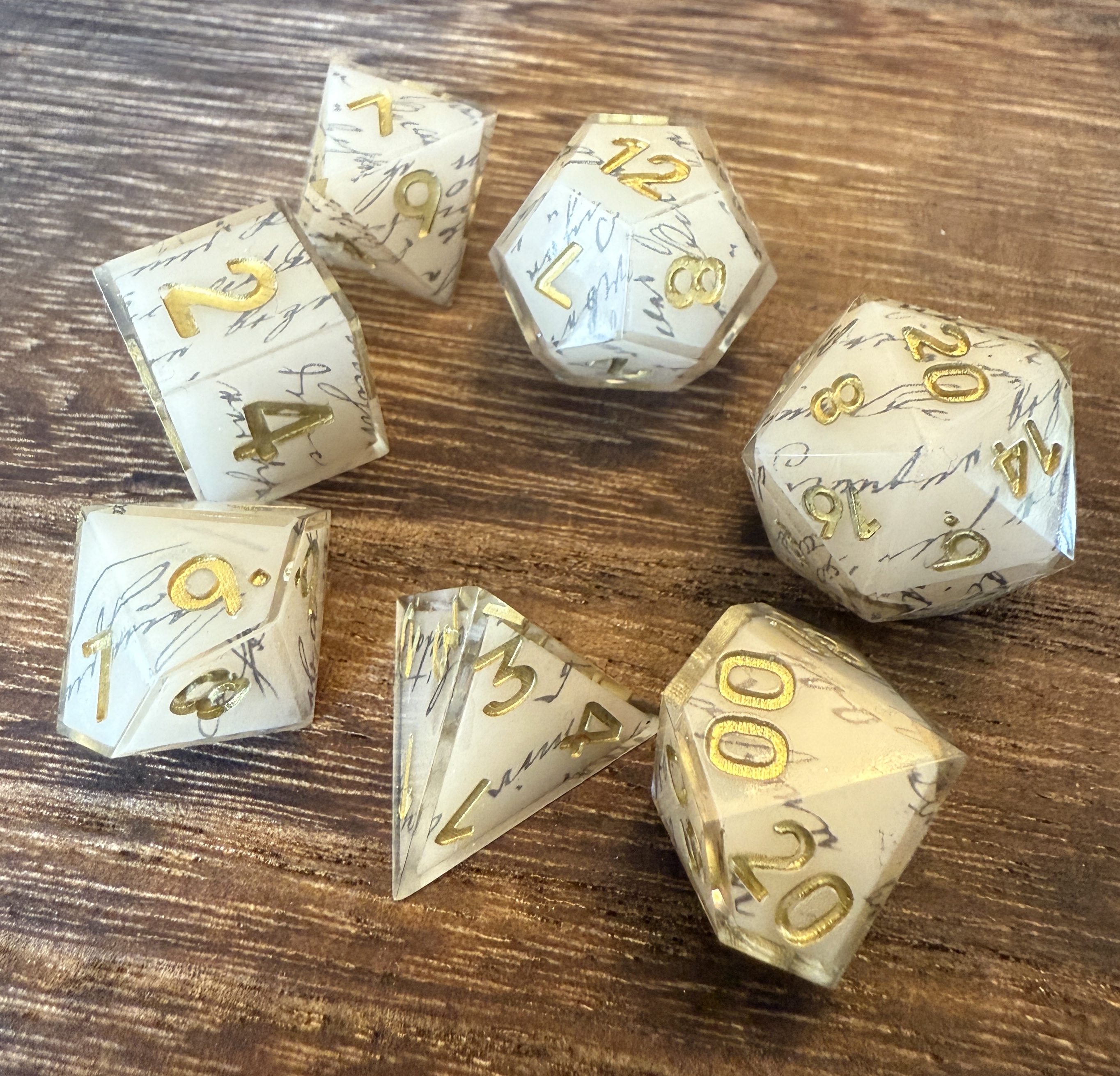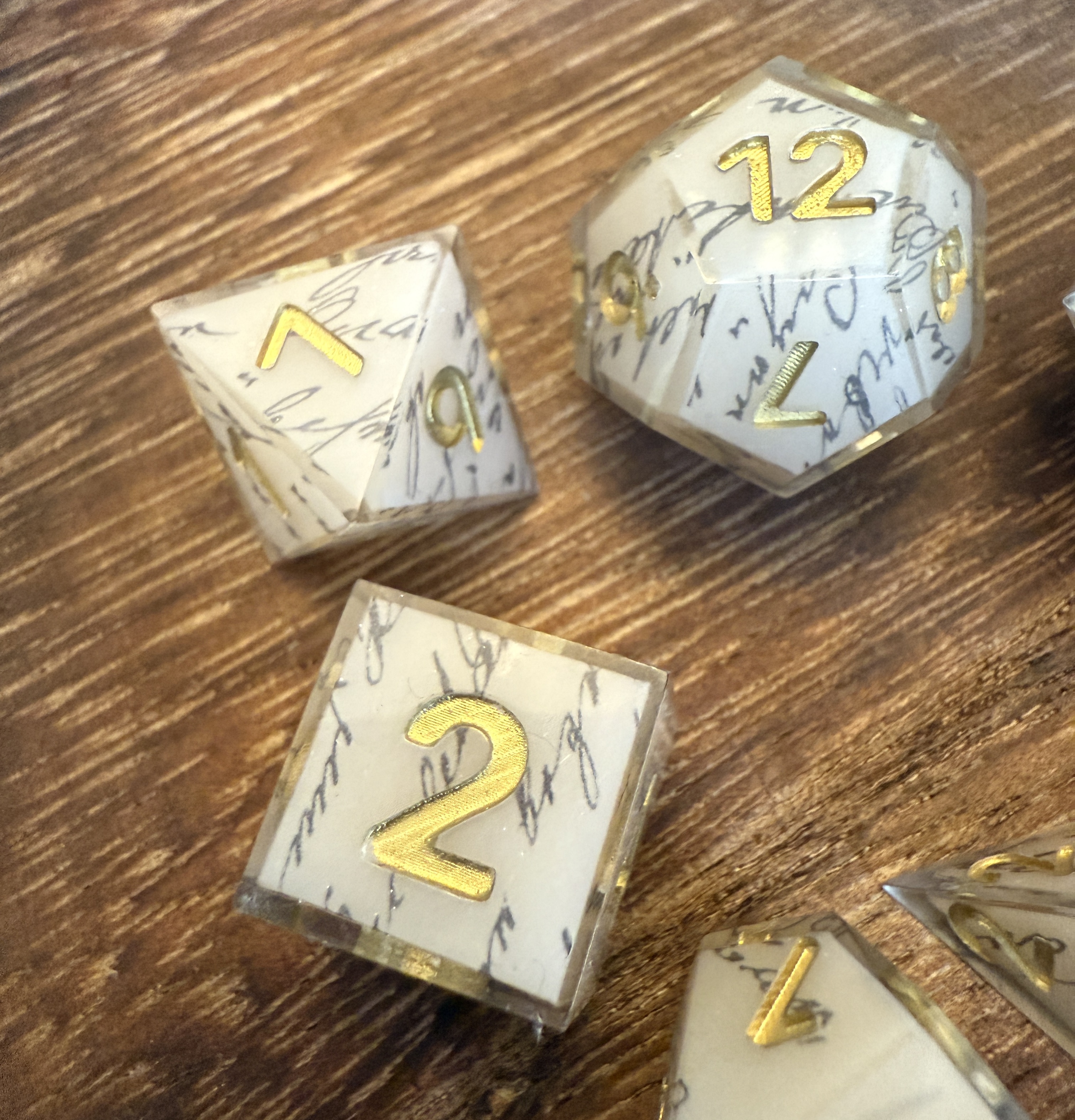 Elevate your gaming experience with this exquisite set of sharp edge dice, featuring script on parchment under a clear resin shell. Each die is meticulously inked with gold numbers, adding a touch of elegance and readability to your rolls.