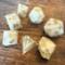 All of my dice are crafted from resin. I hand-pour the resin and add various alcohol inks and mica powders to create beautiful effects. My shell-type dice may include inclusions such as paper butterflies, moss, flowers, etc., and some have the inner shell wrapped in Washi tape. These dice are made using a double casting method (which requires two separate rounds in a pressure pot for 24 hours each): first, the inner dice are cast and a pattern or inclusion is applied, then a second casting of clear resin is done around the insert. The dice are then placed in a pressure pot for 24 hours to remove any bubbles. After curing for a few days, I sand off the excess resin. The dice are then polished in a tumbler with a polishing compound to give them a shine. They are cleaned with soap and water, and then prepared for inking. I hand ink each die, usually in a complementary color, using acrylic inks. Finally, they are polished by hand one last time.